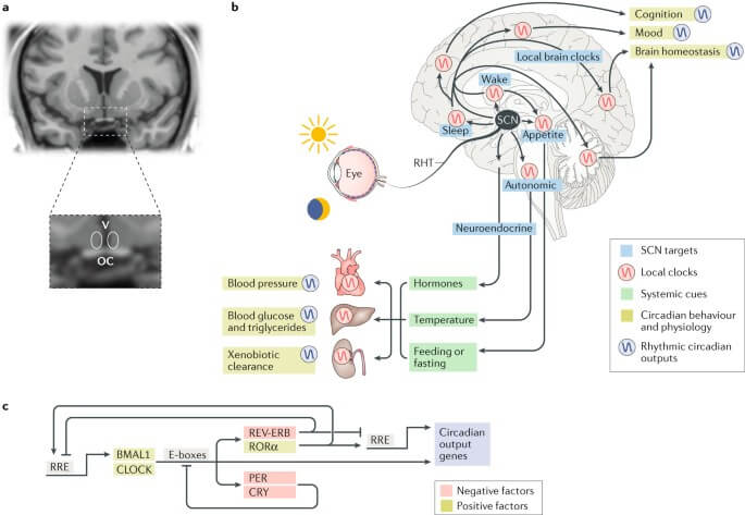The circadian rhythm is crucial to different physiological processes. In addition to sleep, this rhythm helps regulate body temperature, eating and digestion, and hormonal activity. The master circadian clock is found in the hypothalamus of the brain and composed of a cluster of proteins known as the suprachiasmatic nucleus (SCN). In a healthy adult, this clock resets – or “entrains” – every 24 hours based on light and darkness cycles. A healthy person who wakes up in the morning will gradually become more tired throughout the day, and feelings of sleepiness will peak in the evening when it is dark out.
