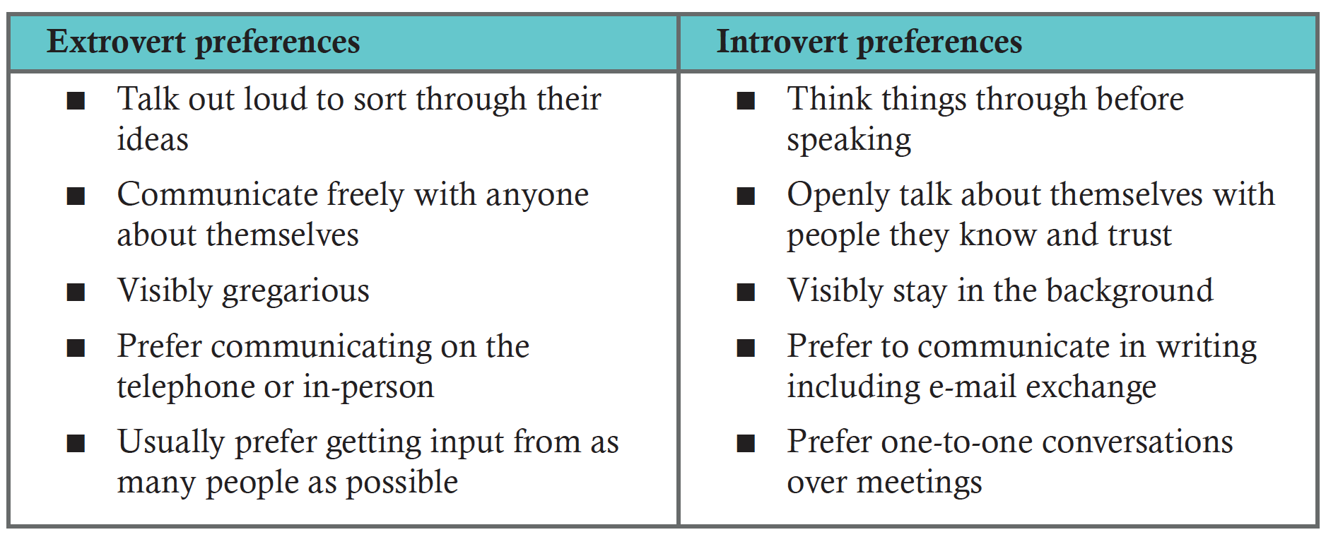 To help both parties, Filidor recommends a 20- to 30-minute break so everyone can self-regulate. It will give the introvert more time to process, while the time won't seem too long for the extrovert who wants to deal with the issue head-on. "Differences on conflict resolution can be one of the biggest causes of conflict," she says. "It's important to be clear about what the needs and expectations are of one another when conflict arises or when there's tension."