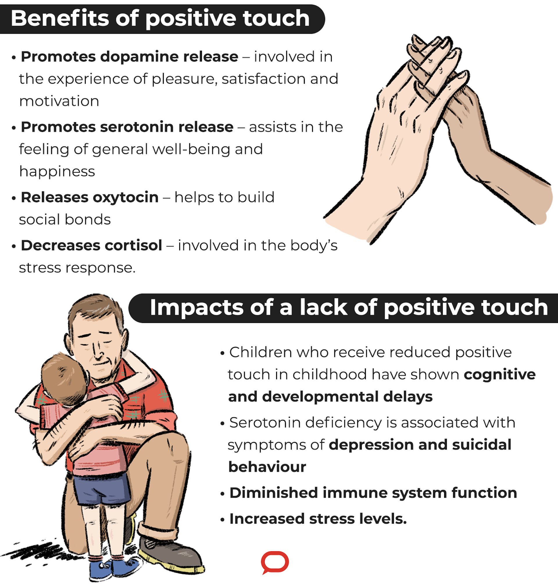 In early life, touch is thought to be crucial for building healthy relationships by stimulating pathways for oxytocin, the natural antidepressant serotonin, and the pleasure neurotransmitter dopamine.