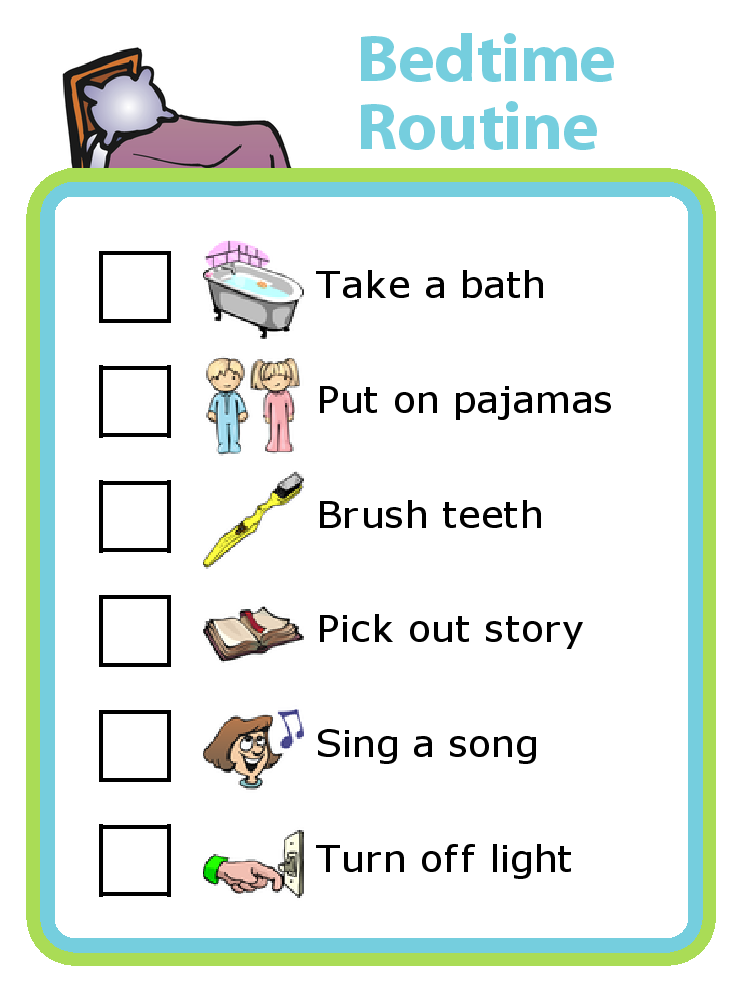 If you are starting a new sleep routine for your child, make them part of the team by explaining the new plan to them if they are old enough to understand. For a young child, try using a picture chart to help your child learn the new routine, showing actions like changing clothes, brushing teeth, and reading a book.